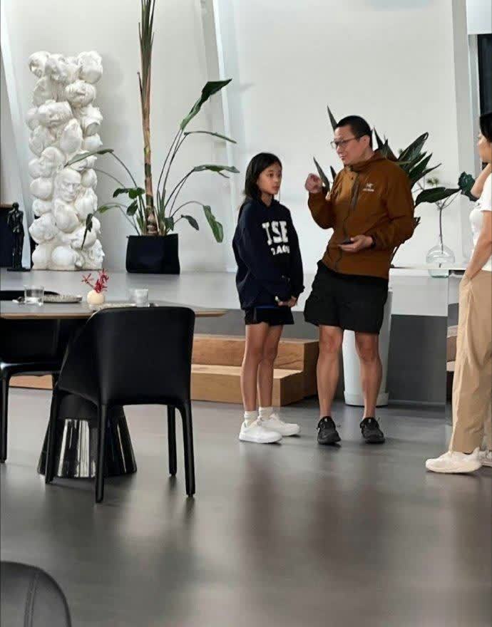 照片中,快快穿一件黑色的卫衣配一件短裤,身形纤细修长,五官精致,扎着丸子头,有些害羞地站在爸爸身边。